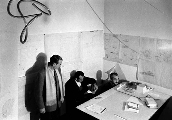 Fig. 01. Espacio de trabajo del Instituto de Arquitectura UCV con una maqueta y láminas del proyecto de la iglesia Santa Clara, c. 1954.