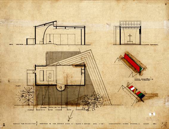 Fig. 02. Lámina del proyecto de la capilla en el fundo Los Pajaritos, desarrollado por Miguel Eyquem, c. 1952.