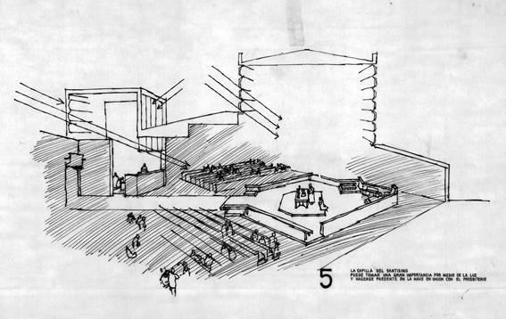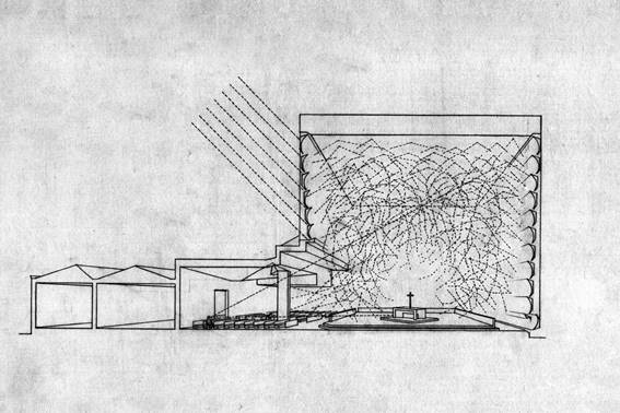 Pensamos en la arquitectura del acto, hoy, cuando todo aparece transido por el goce de la eficiencia que grita la renovación de las técnicas e invenciones. Los grandes arquitectos de hoy día con sus doctrinas, teorías, congresos, cantan ese advenimiento como la modernidad. Cantan las formas. Pero aún si se lograran esas formas —bellas, constructivas, funcionales— con un equipo realizador... ¿no fracasaría, a pesar de todo, este dar cabida por medio de presencias que caen al ojo con sus destellos, tal como fracasan en todas las iglesias habituales o ‘modernas’? Iglesias de formas presentes. Esta, quiere ser, en cambio, iglesia de la forma de la ausencia. Iglesia de la ausencia que abre posibilidades y técnicas y no formas hijas de las posibilidades (Escuela de Arquitectura UCV 1972).