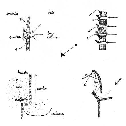 Se trataba de hacer entrar la luz exterior a través de una doble reflexión, fenómeno basado en la corrección de la dispersión de la luz en raíz cuadrada de la distancia de su fuente. Esta corrección la realiza la curvatura progresiva de la superficie captora de la luz, desarrollada en módulos horizontales cubriendo la totalidad de cada pared (Eyquem 2016, 61).