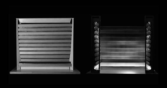 En estos modelos, el arquitecto exploró diversas curvaturas, geometrías y materiales —pigmentos de la gama roja, vidrios prismáticos, cerámicas blancas y superficies reflectantes de aluminio pulido—, pero lo decisivo fue la posibilidad de observar el comportamiento de la luz en escala real, comprendiendo la materialidad y las leyes ópticas que determinaban el diseño del muro (Fig. 06).
