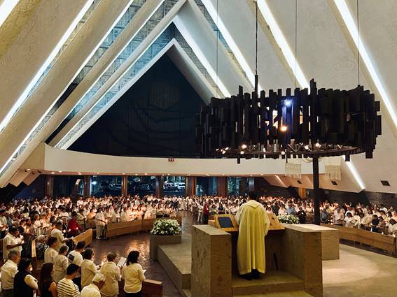 La iglesia también es famosa en el ámbito católico de la ciudad por la calidad de sus celebraciones litúrgicas, que atraen a feligreses más allá del territorio parroquial. Tal calidad es resultado del carisma de la congregación a quien está encomendada —los Misioneros del Espíritu Santo— así como de la misma arquitectura. La posición central del presbiterio, que integra magistralmente altar, ambón, sede y sagrario en una composición frugal pero contundente, y en torno al cual se dispone la feligresía en forma de abanico, hace de éste un espacio característicamente postconciliar (Fig. 03). La sobriedad plástica ya mencionada es conducente a un ambiente de contemplación y silencio que hace eco de la espiritualidad que caracteriza a los Misioneros.