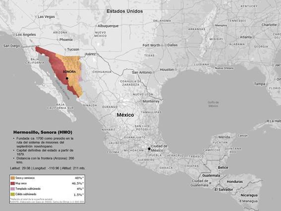 El estado de Sonora, localizado en el extremo noroeste de México, es el segundo en extensión geográfica con 179,355 km² —aproximadamente al 9% de la superficie del país—, compartiendo con el de Arizona 588 kilómetros de frontera. Aunque presenta diversos ecosistemas, que van del costero en el litoral del Golfo de California al de montaña en la Sierra Madre Occidental, destacan el de clima cálido seco a muy seco que afecta al 94% del territorio, con temperaturas estivales cercanas a los 50° C (Fig. 01). El territorio de la actual ciudad capital estuvo ocupado desde 1700; el asentamiento formal se fundó en 1741 como San Pedro de la Conquista del Pitic, presidio integrado a las rutas misionales del septentrión novohispano. A finales del siglo XVIII adquirió rango de villa con el nombre de Guadalupe del Pitic y, en 1828, fue rebautizada como Ciudad de Hermosillo. Con la fundación del estado de Sonora en 1831 obtuvo la capitalidad, la cual se consolidó de manera definitiva en 1879 y quedó jurídicamente confirmada con la Constitución de 1917.