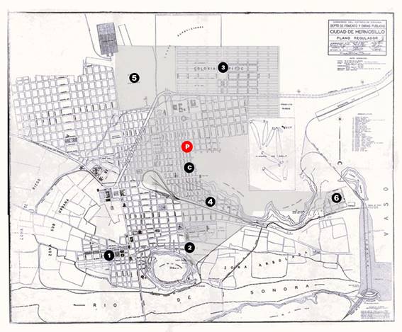 Fig. 04. Titularidad territorial urbana de la parroquia del Sagrado Corazón de Jesús (1957). P. Parroquia Sagrado Corazón de Jesús, C. Centro María Auxiliadora, 1. Catedral Nuestra Señora de la Asunción, 2. Capilla del Carmen, 3. Capilla del Espíritu Santo, 4. Capilla del Inmaculado Corazón de María, 5. Capilla de Santa Eduwiges, 6. Capilla de la Sagrada Familia. Elaboración propia con base en el plano regulador de la ciudad de Hermosillo, Departamento de Fomento y Obras Públicas, 1947.