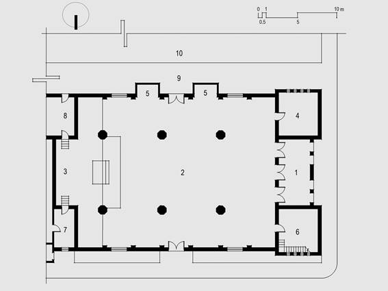 Fig. 08. José López Moctezuma Pineda y José López Moctezuma Cumming, Templo del Sagrado Corazón de Jesús, Hermosillo (Sonora, México), 1950-59; planta arquitectónica. Aforo: 300 fieles. 1. Pórtico de acceso; 2. Nave (aprox. 427 m²); 3. Presbiterio; 4. Bautisterio (hoy bodega); 5. Confesionarios; 6. Bodega y acceso al coro (hoy nichos funerarios); 7. Sacristía; 8. Salón de ministros; 9. Patio de servicio; 10. Servicios parroquiales. Representación aproximada del estado original con base en levantamiento arquitectónico, 2025.