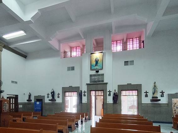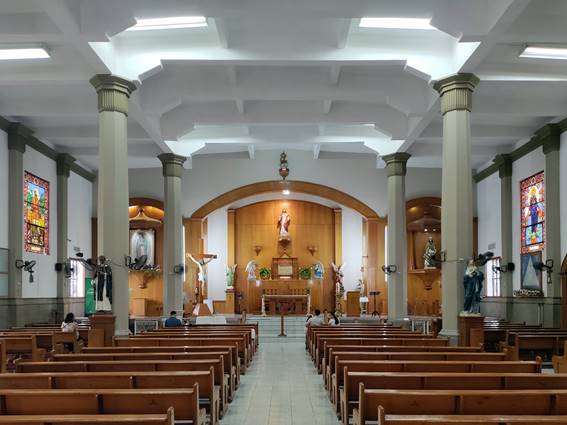 La planta (Fig. 08), concebida en las postrimerías de la liturgia preconciliar, siguió una composición basilical para alojar aproximadamente 300 fieles en orientación este-oeste, pero prescindiendo de transepto, donde los espacios litúrgicos y sus funciones son plenamente identificables, con el coro sobre el pórtico de acceso (Fig. 09-10). La diferencia de alturas entre la nave principal y las laterales es mínima, dando la apariencia de uniformidad, si bien el tratamiento de las trabes enfatiza la jerarquía espacial: con geometría regular en las segundas, y con perfiles más elaborados en la primera. El presbiterio, dominado por una imagen del Sagrado Corazón desde un austero retablo, está flanqueado por amplios nichos que muestran a la Virgen de Guadalupe y a san José con el Niño Jesús (Fig. 11).