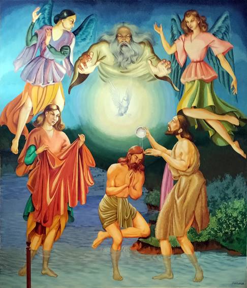 El mural sobre la pila bautismal empotrada al muro poniente —ahora fuera de la vista pública—, muestra la representación del bautismo de Jesús, obra de Francisco Castillo, [12] que con un estilo de inspiración prerrafaelita enfatiza la jerarquía trinitaria (Fig. 18). Se evidencia la intención de un ambiente austero, plenamente iluminado desde el sur en un espacio contenedor que centra la atención en el ritual, en tanto que el acto sacramental se refuerza iconográficamente, cumpliendo su función doctrinal como pieza de arte sacro. Se hace así evidente el papel compositivo de la luz; el resultado final, por lo menos para los servicios diurnos, habría sido —de no haberse practicado las ventanas para ventilación debajo de los vitrales— una suerte de camera obscura, con los vitrales tomando un papel protagónico y quizás vistiendo la nave con una leve pátina encarnada desde las vidrieras tintadas en el coro.