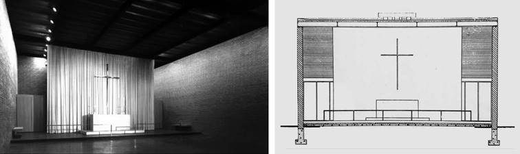 which axially articulates and shelters the forecourt, the nave, and the altar