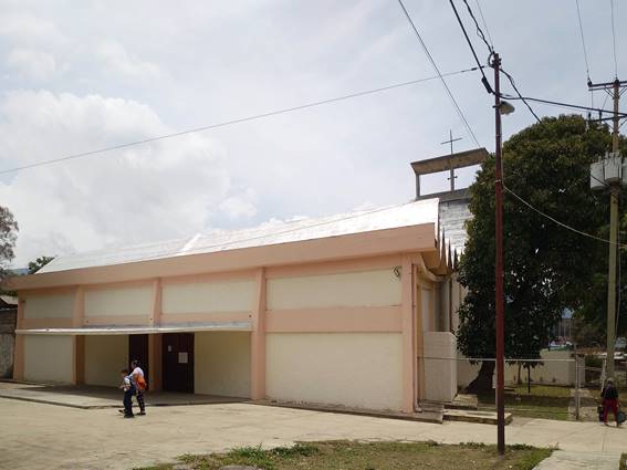 La principal característica de esta iglesia es que se conforma como un solo volumen con algunos sobresalientes de pequeña escala: cinco a los lados y un anexo bajo y autónomo. La fachada principal es extremadamente simple y no presenta ninguna característica que identifique su función, salvo el campanario con la cruz que puede observase en el fondo. En cambio, sus fachadas laterales son más elocuentes. [10] Sobre unas paredes rugosas sin ventanas, [11] se apoya y despliega la cubierta de plegaduras, en forma de curva ascendente, dejando aperturas triangulares, y que remata en lo más alto en una pequeña platabanda que contiene los altoparlantes —en vez de campanas— y la cruz. La fachada posterior es una gran pared esbelta y alta que deja igualmente a la vista la estructura, una escalera marinera y el remate superior. A un lado, la sacristía pasa casi desapercibida al ser un volumen de baja altura y gran simpleza. Igualmente sucede con los volúmenes sobresalientes (Fig. 03-04).