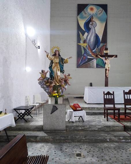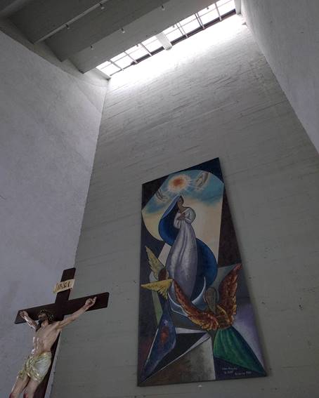 Fig. 08. Carlos Raúl Villanueva, La Asunción de Nuestra Señora, Caracas (Venezuela), 1957-59; Crucifijo de procedencia española y cuadro de Nuestra Señora de La Asunción (Pilar Ananda San José, 1963), originales de la capilla.