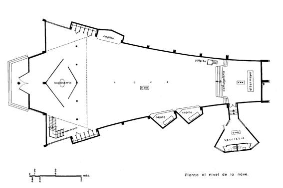 La forma expresiva de la edificación evidencia que no surge por composición, como suele suceder en arquitecturas Beaux Arts y racionalistas, sino como expresión de una intención original. Sintetiza un concepto, como se advierte en el boceto que Villanueva dibuja al inicio del proceso de diseño. En ese boceto se encuentra todo: el techo ascendente plegado, las paredes convexas y convergentes, la entrada baja y discreta y la cruz como remate final de todo el volumen. El interior se puede, además, inducir como consecuencia directa de ese gesto expresivo: un espacio único, direccionado en un solo sentido (Fig. 10-11).