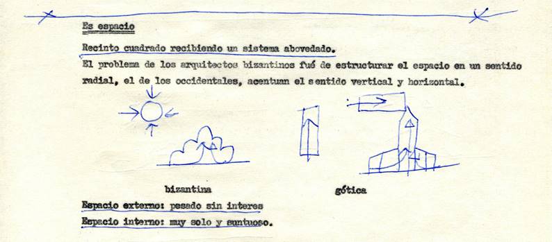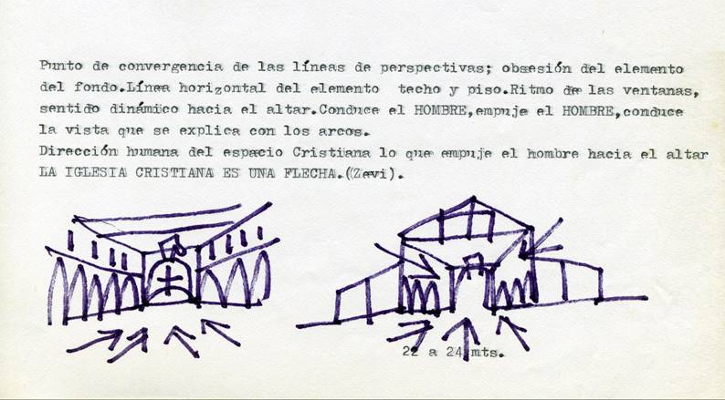 En segundo lugar, revisando sus apuntes docentes, se encontraron algunas reflexiones clave que indican el nivel de comprensión de lo significa una iglesia para Villanueva. Estos apuntes pertenecen a las clases dedicadas al tema de los templos, y en particular a la historia de las iglesias cristianas. Es aquí donde se encuentra el concepto de flecha por medio del cual sintetiza su propuesta.
