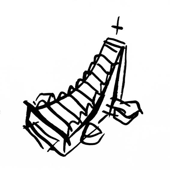 ¿Cómo se evidencia esa flecha en la iglesia de La Asunción? En primer lugar, en su forma: la flecha se ve claramente en la expresividad formal ascendente del exterior y en la potencia de la iluminación del interior, hacia donde se dirige la mirada. Y en segundo —y sorprendente— lugar, entre líneas: esta flecha se encuentra y se comprende en el pensamiento proyectual que la fundamenta; un pensamiento que, de manera sintética y genial, coincide con el concepto de iglesia; no solo de la edificación, sino también de la definición de ecclesia, y por ende, de la domus ecclesiae. La iglesia es el edificio donde —en palabras del entonces cardenal Ratzinger— «Cristo mismo realiza el culto ante el Padre, se convierte en culto para los suyos, desde el momento en que se reúnen con Él y en torno a Él» (2001, 84). Es, pues, el signo material, tectónico, de la comunidad de fieles, unidos por la convicción de ser la continuidad de la encarnación del misterio en la figura humana de Jesucristo. El pensamiento de Villanueva reafirma esta definición: en esta iglesia, Dios y hombre se unen linealmente por medio de una flecha (Fig. 14). [18]